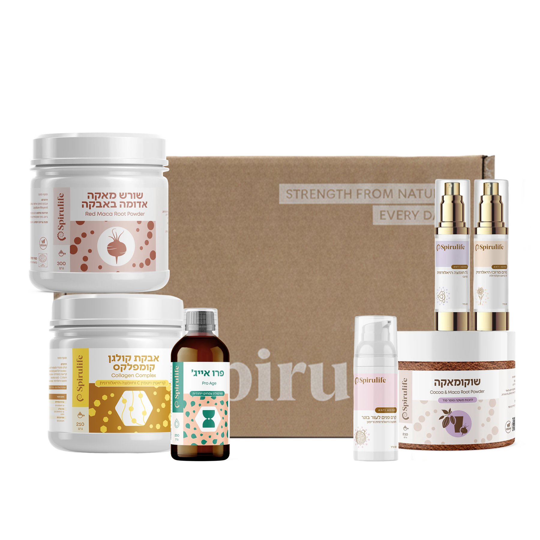 המוצרים בערכה מבוססים על רכיבים איכותיים וטבעיים ונבחרו כך שיעבדו יחד בצורה סינרגטית ומדויקת. זה לא אוסף אקראי של מוצרים, אלא שילוב חכם של פורמולות פרימיום שנבנו כדי לתמוך בגוף לאורך זמן.