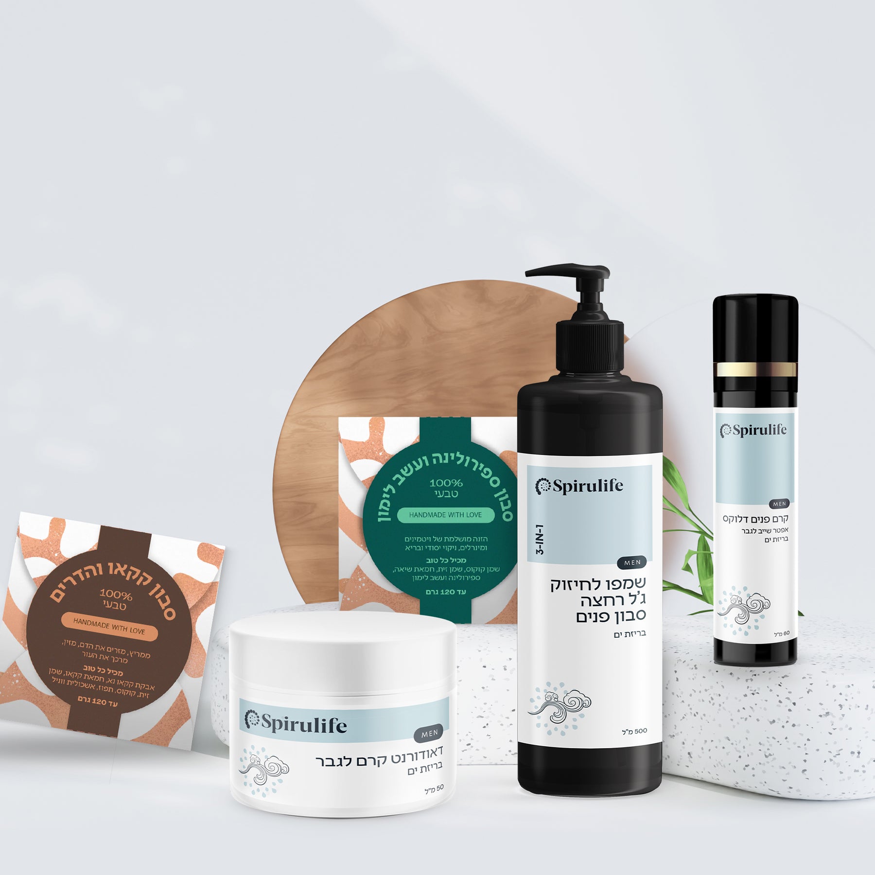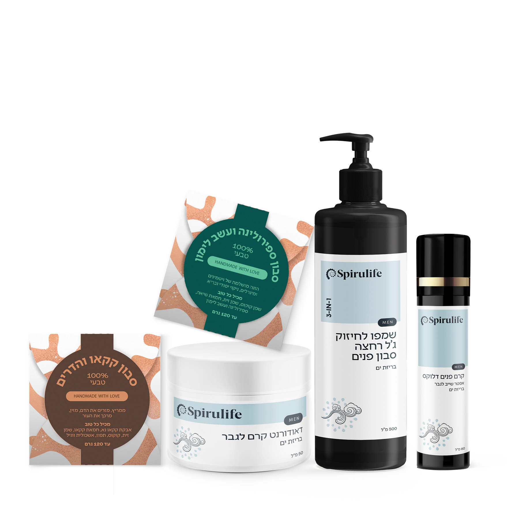 1.סבון ספירולינה ועשב לימון - סבון טבעי עם מזון העל ספירולינה, ששומר על לחות העור לאורך זמן. מתאים לכל סוגי העור, כולל עור בעייתי. מכיל שמן שקדים, חמאת שיאה, עשב לימון ורכיבים נוספים המבטיחים עור נעים וחלק.