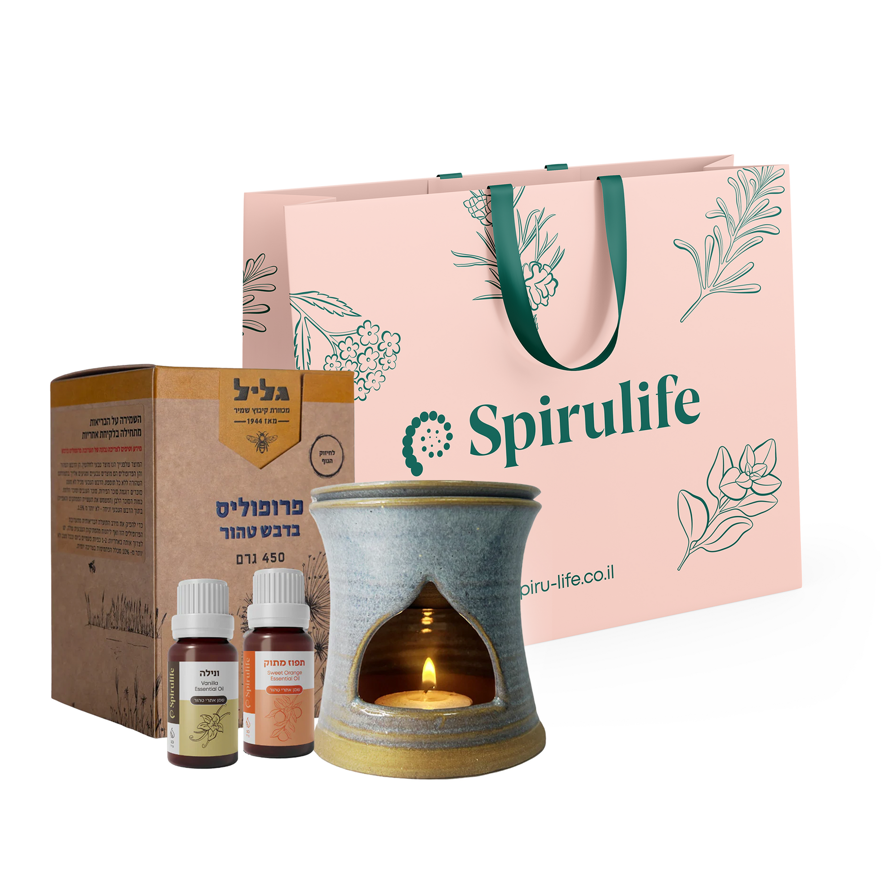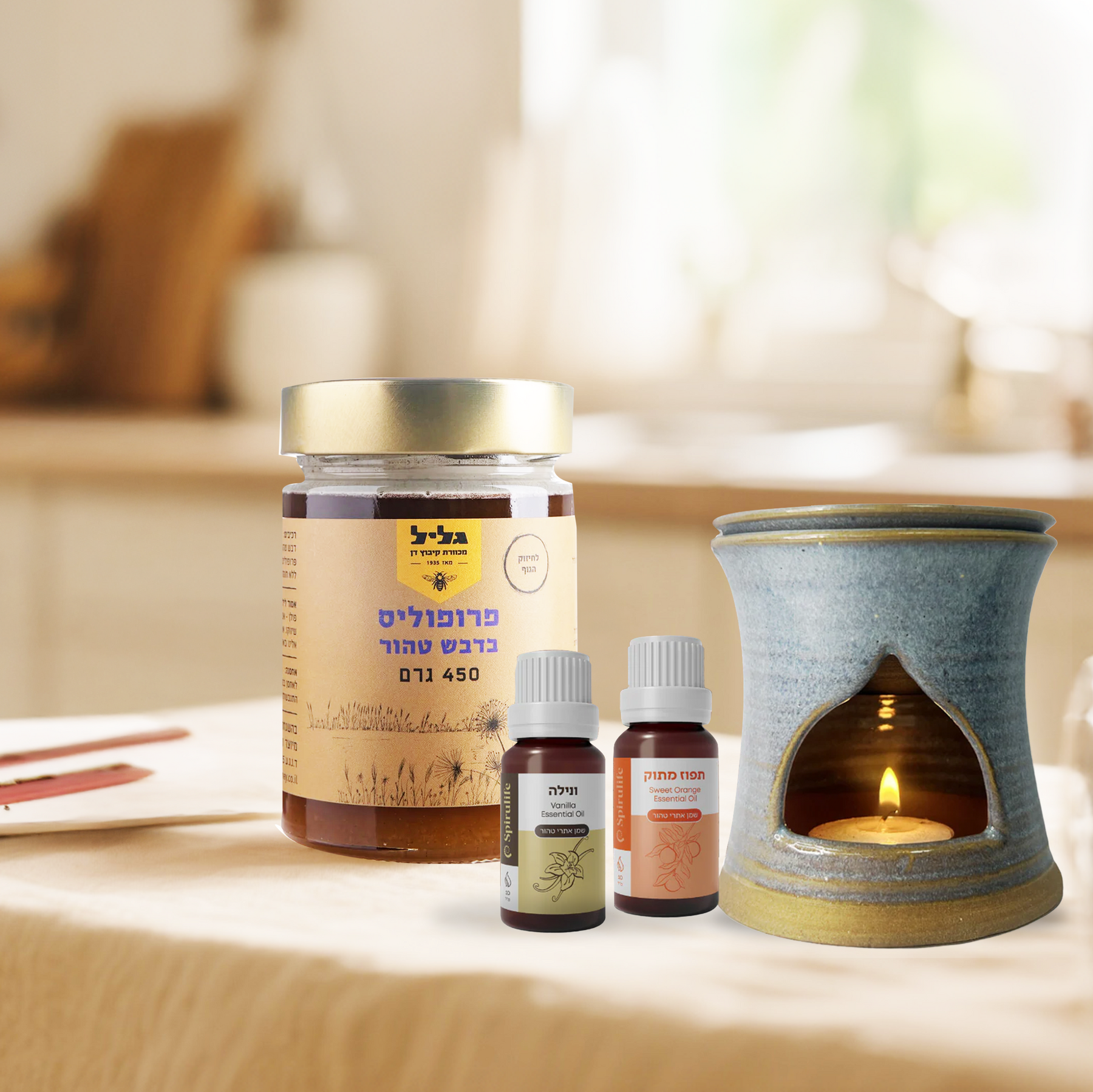 קבלו דבש טהור עם מזון העל פרופוליס העוצמתי שאין שני לו בקטילת חיידקים, פטריות ונגיפים, מבער שמנים מעוצב מקרמיקה בעבודת יד בתוספת 2 שמנים אתרים נפלאים: תפוז מתוק וונילה להעלאת מצב הרוח, הרגעה וניחוח קסום ומטהר בחדר.