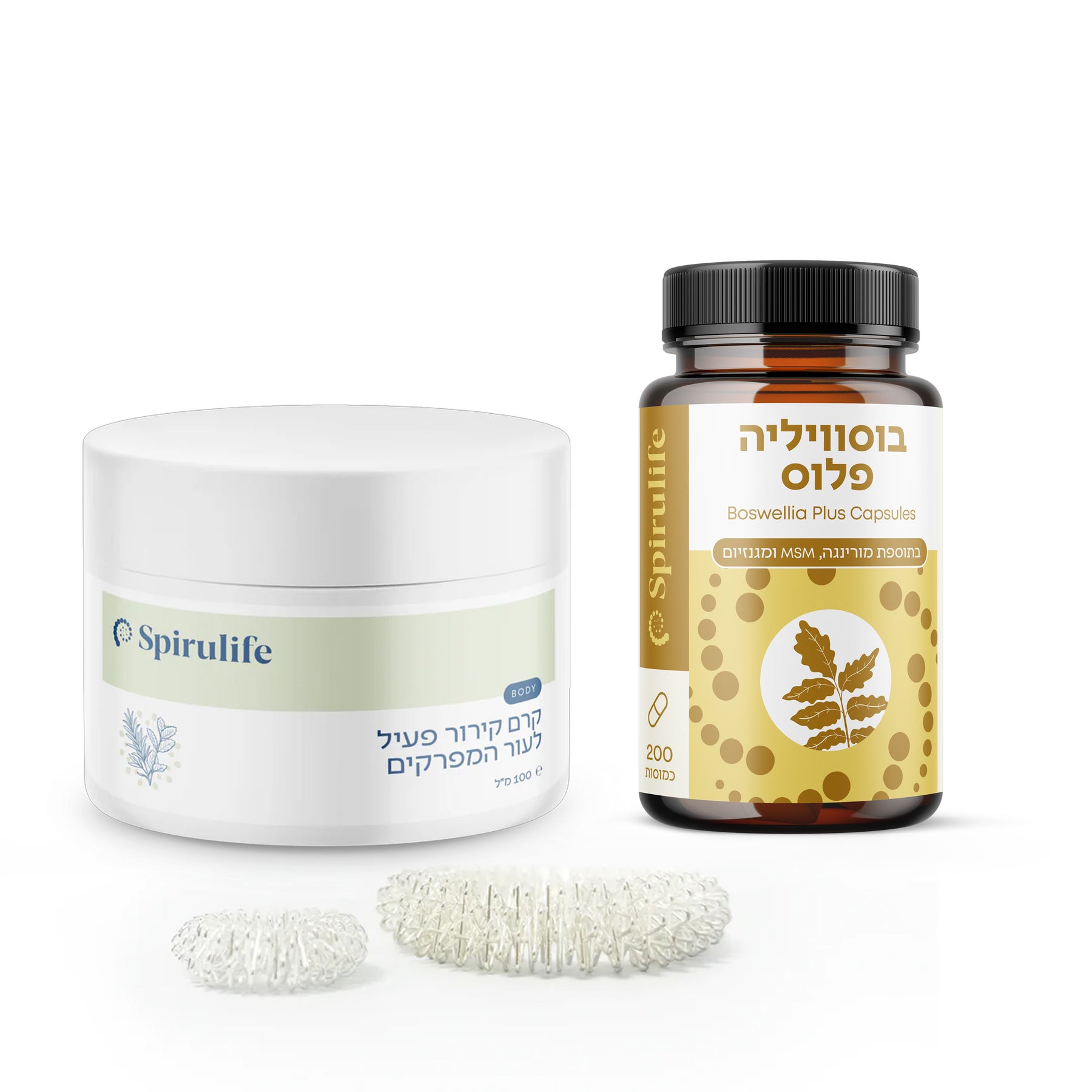 הערכה כוללת כמוסות בוסווליה פלוס להפחתת דלקות וכאבים במפרקים, קרם קירור עם מנטול ורוזמרין להקלה מקומית מהירה, וערכת סוג'וק ללחץ עדין על נקודות מפתח בכף היד שמסייעת לשחרור חסימות אנרגטיות.
