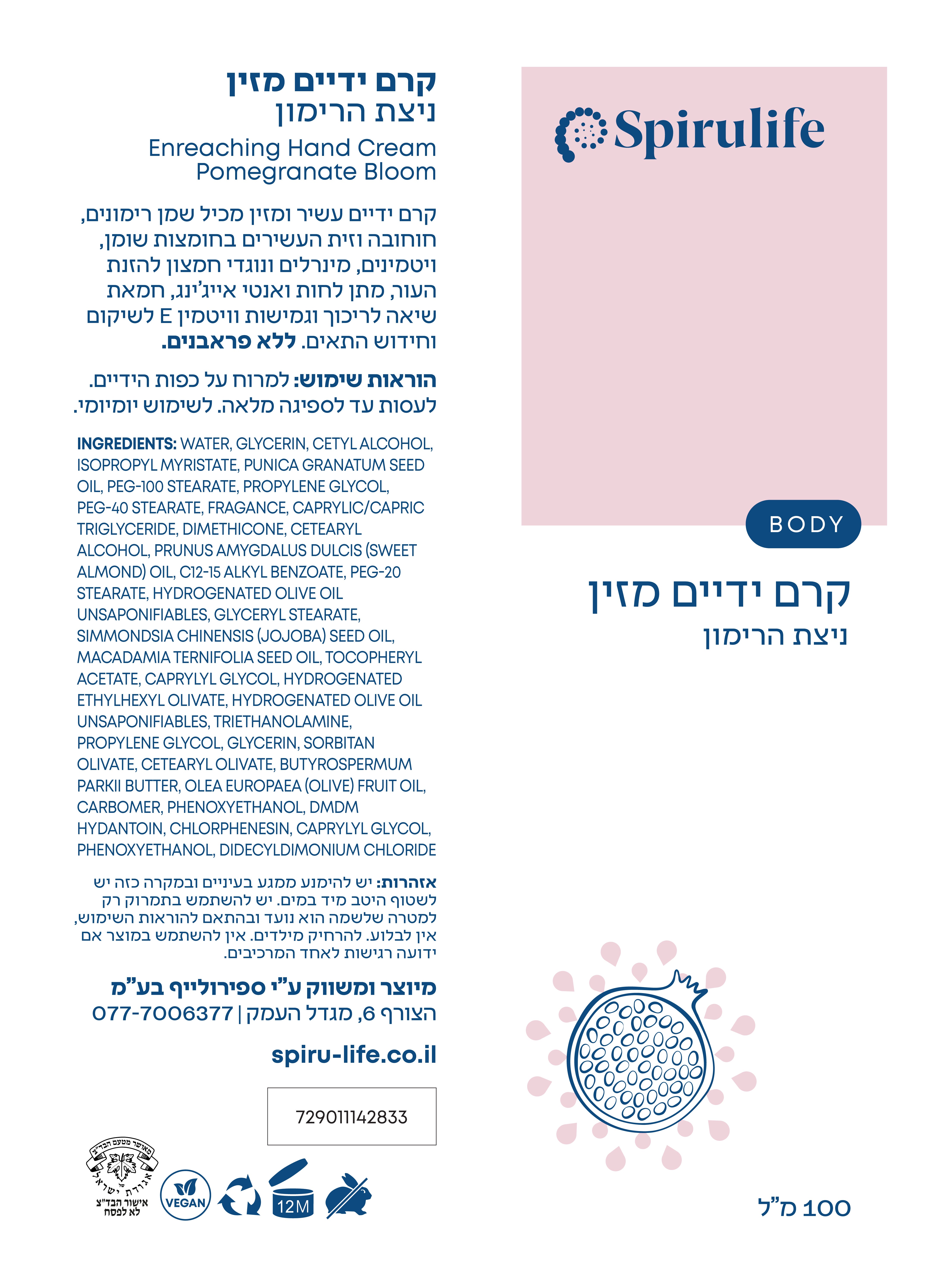 עשיר בחומצת שומן אומגה 5 (פוניקית) אנטי דלקתית וחומצה אולאית להזנה, החלקת קמטים, מיצוק, וגמישות העור לאנטי אייג'ינג. מסייע להבהרת העור, שיקום עור יבש ופגום. מרגיע גירויים ואדמומיות.