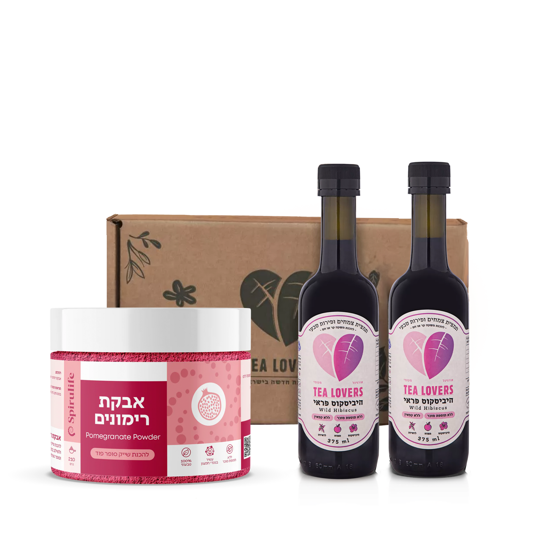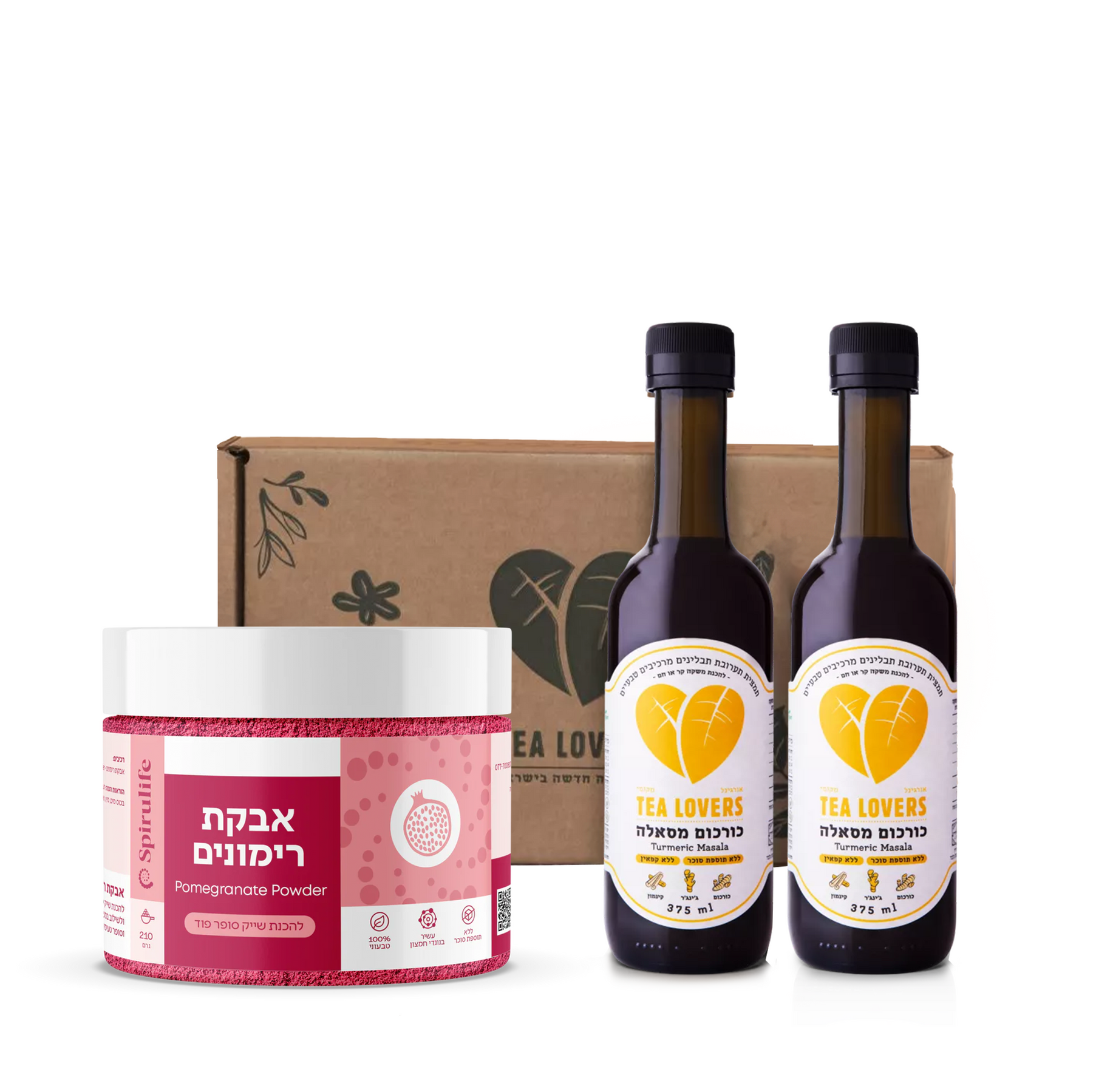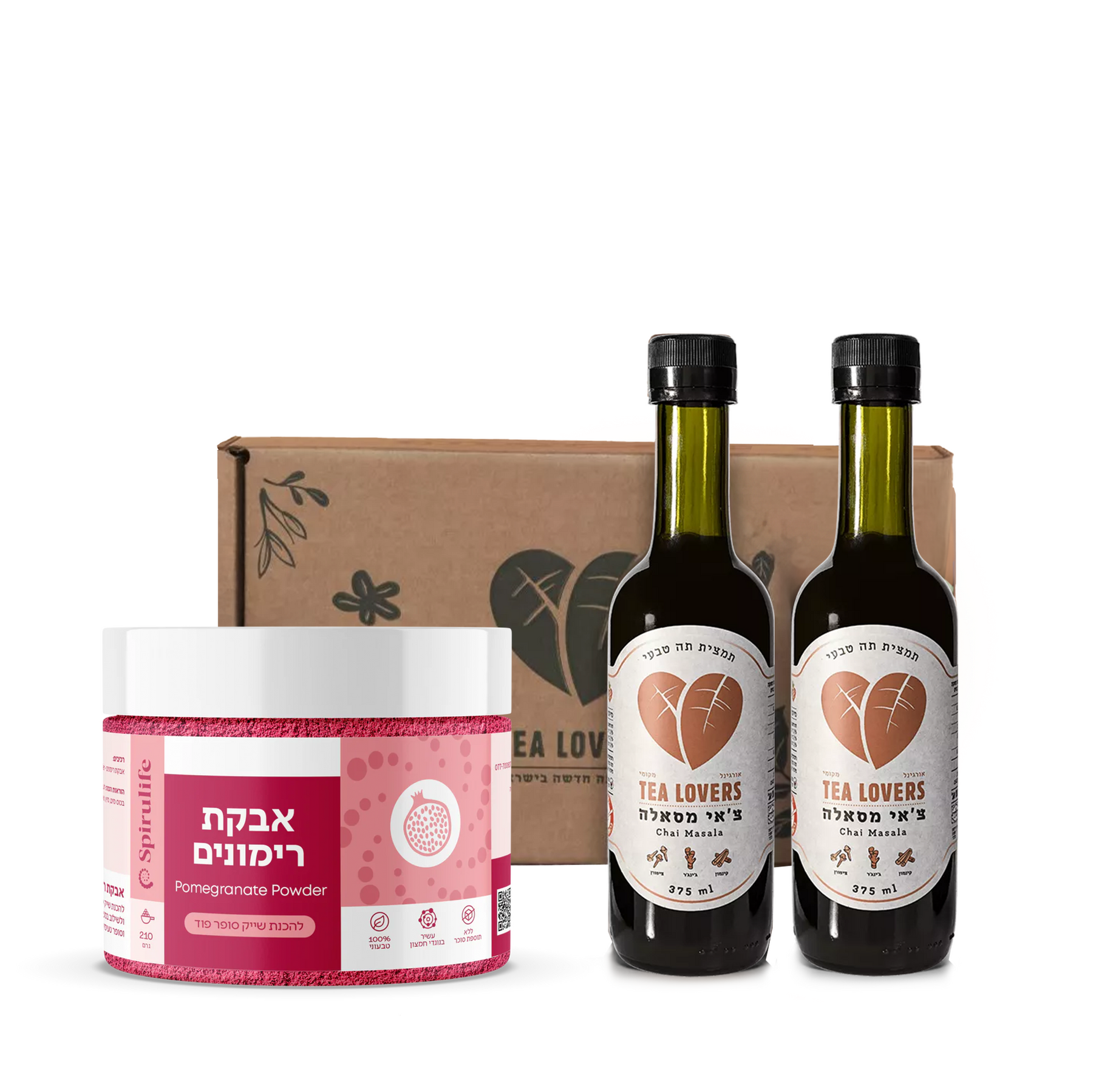 סאני – תה ירוק עם פסיפלורה ותפוח, מועשר בסוכר קנים, מרענן ומחזק את תחושת האנרגיה. היביסקוס פראי – היביסקוס ולואיזה בשילוב תפוחים, חליטה בעלת צבע מרהיב וטעם פירותי חמצמץ עם אפקט נוגד חמצון טבעי. צ’אי מסאלה – תערובת מסורתית של ג’ינג’ר, קינמון, תה שחור, ציפורן ותבלינים נוספים, לחימום הגוף, עידוד זרימת הדם וחיזוק מערכת החיסון. כורכום מסאלה – שורש כורכום עם ג’ינג’ר, קינמון, הל ותבלינים, תערובת אנטי־דלקתית טבעית התורמת לחיזוק הגוף ולאיזון פנימי. וכל הטוב הזה בשילוב אבקת רימונים טבעית המופקת מכל חלקי הפרי, עשירה בויטמינים, נוגדי חמצון, משתלבת מצוין במשקאות קרים, שייקים, קינוחים, ומעניקה צבע, טעם ורעננות בריאה.