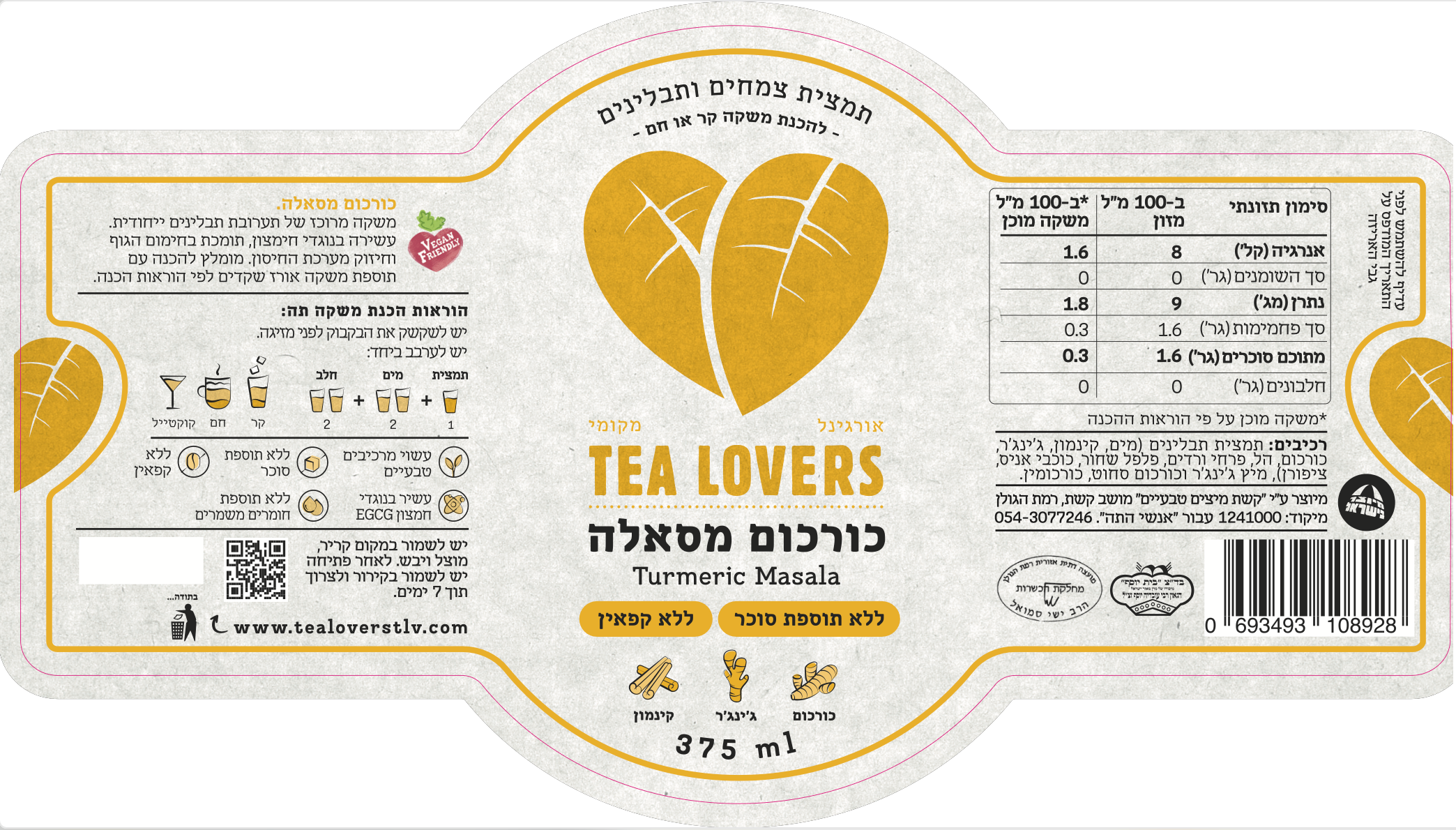 תמצית של תערובת תבלינים ייחודית בתוספת שורש כורכום וג'ינג'ר אמיתי התומך בחימום וחיזוק הגוף ועשיר בנוגדי חמצון, עם קינמון, ציפורן ותבלינים שנותנים ארומה מדהימה מהמזרח הרחוק. ללא קפאין וללא תוספת סוכר, בריאות אמיתית להכנת משקה בריאות חם או קר. מכיל 375 מ"ל ומתאים להכנת 12-15 כוסות שתיה.